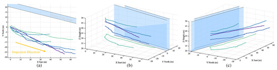 where is the coordinate of power line points in ; , , and are the distances between the origins and two coordinate systems; and is the declination angle between the UAV heading and North, which could be obtained by the magnetic compass on the DJI UAV. Other parameters in the rotation and translation operators are calculated by the open-source camera/IMU calibration toolbox Kalibr [25], which could jointly calibrate the camera and internal IMU with millimeter precision. After all power line points are converted into , the target flight point with the yaw value in is calculated for motion planning. Power line points are projected into the horizontal and vertical planes. Then, the average slopes of the projected power lines on these two planes are calculated as and , respectively. For a predefined flight distance L of each movement, the y value of target point could be calculated as
