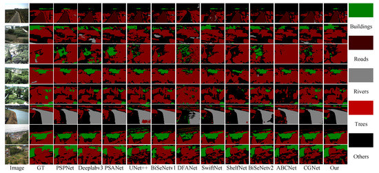To qualitatively validate the effectiveness of the proposed semantic segmentation network, we firstly visualize the segmentation results generated by our method and 11 comparative methods in Figure 16. As shown in Figure 16, introduced by the class-aware edge, the proposed method could segment the image with fine boundary. Compared with the segmentation results of other methods, the proposed method could segment the ground objects more completely. The boundaries of big objects such as roads or rivers in the segmentation results are continuous and accurate. Meanwhile, due to the huge scale differences of categories in the proposed dataset, comparison methods generally have poor classification and segmentation performance for small areas.