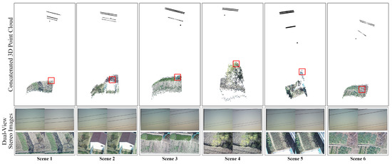 Figure 18b,c show two typical scenes of transmission line, which are reconstructed by the Livox Avia LiDAR and our system, respectively. Specifically, the red box marked in the LiDAR point cloud shown in the upper part overlaps with the reconstruction result of our dual-view stereovision-guided system shown in the lower part. Subsequently, the clearance distances between the power lines and objects below in the two overlapping scenes measured by two means are shown in Figure 18d.