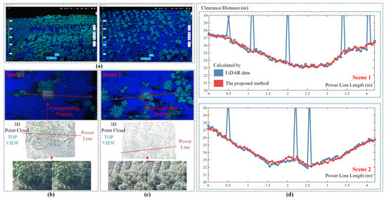 Experiments of ground clearance measurement. (a) Local 3D point clouds of transmission line acquired by Livox Avia LiDAR and its professional software. (b,c) Two different scenes for evaluation. (d) The clearance distances of power line points calculated by the LiDAR data and the proposed method.