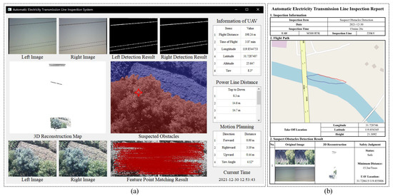 Interface and the generated patrol report of the inspection platform. (a) The visual interface of the automatic electricity transmission line inspection system; (b) The report of the automatic electricity transmission line inspection system.