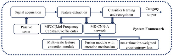Figure 1 shows the proposed whole recognition system framework. All the data used in this paper are acquired by a passive sonar. After obtaining the acoustic data, several features are obtained, like Mel-Frequency Cepstral Coefficients (MFCC) [18,19,20], which have a natural anti-low frequency noise performance and can suppress underwater acoustic noise to highlight the target information. Then, the MR-CNN-A network is used to realize the extraction and fusion of a multi-scale feature using a multi-scale network and attention mechanism. After that, the CFWCEL is used to realize the insensitivity to imbalanced data. Finally, the fully connected layer with softmax is used as the classifier layer to obtain the predicted category label.