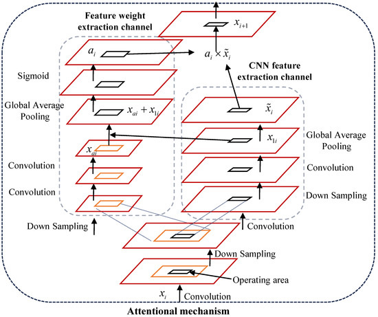 Generally speaking, smaller-scale samples pay more attention to the overall outline, while higher-scale samples pay more attention to the details of the target. With the fusion of different scales of samples, more details of the target can be obtained. Consequently, a multi-scale feature learning and fusion block are used in the proposed network. To obtain the multi-scale feature, several convolutional kernels with different sizes are used as the different scalers in which the size of convolutional kernel represents the scale size in different channels. After feature extraction in each channel, an attention mechanism is used to fuse the features in different channels. Figure 2 provides the attention-mechanism-based feature fusion framework. Attention-mechanism-based feature fusion always makes CNN intelligent enough to recognize important objects from a messy background and complex scenes. In other words, the fusion can greatly improve its anti-noise ability for the target recognition task. Attention-mechanism-based feature fusion can be simply understood as a feature selector, which enhances good features and suppresses redundant features (i.e., noise) [23,24,25]. The core idea of attentional mechanisms is to find the correlations between different data. According to the correlations, a re-weighted feature is obtained from the input feature.