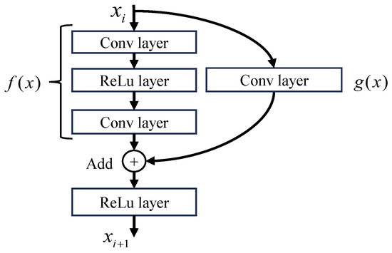 Residual learning was firstly proposed by He et al. [26] to address the problems of gradient vanishing and explosion. The schematic diagram of its network module is given in Figure 3. As the figure shows, the input feature is set as and the output feature is set as , which is also the input of next layer. is the layer function without residual learning operation with two convolutional layers and one relu-nonlinear activation layer. The skip connection on the right side is called shortcut cross-layer connection, which is performed as an extra feature learning operation using a convolutional layer with kernel size. represents the shortcut cross-layer function. Finally, the output feature can be obtained as . With shortcut cross-layer connection, the block can be used to learn more information of the target and improve the recognition accuracy. In view of this, we add a residual learning module to each convolution layer to improve the feature learning ability.