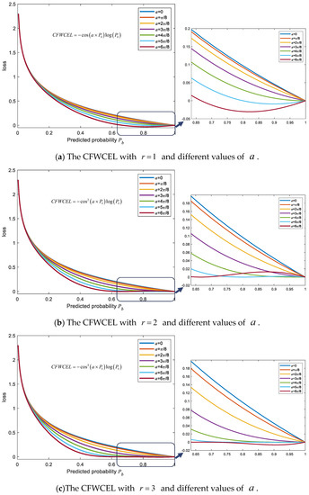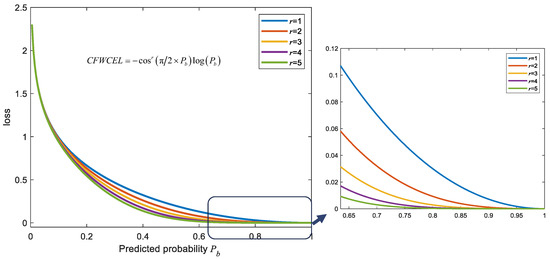 where is the prediction probability of a given sample and . is the standard cross-entropy loss and is the added weighted factor to readjust the weight of cross entropy loss. In detail, is the regulator of , which takes odd and even numbers greater than 0. is the hyperparameter, which can be any value in general. In particular, when is 0, the CFWCEL turns out to be the standard cross-entropy loss. The optimal values of and are mutually influenced. The two parameters need to be adjusted in combination when evaluating the accuracy. It can be found that is a periodic function, whose period is adjusted by adjusting the values of and .