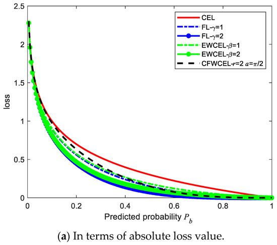 Figure 6a shows the absolute value of each loss function, while Figure 6b displays the value of each loss function relative to CEL. We can see that CFWCEL obtains the largest absolute gradient at , which is exactly the boundary between the easy samples and the hard samples. It means that CFWCEL is more sensitive to the difference between easy samples and hard samples. Actually, CFWCEL pays more attention to the samples which are difficult to separate and can better adjust their weights. It can also be seen that this difference between easy samples and hard samples is obviously larger than EWCEL [10] and Focal Loss [12], so CFWCEL is more suitable for an imbalanced dataset.