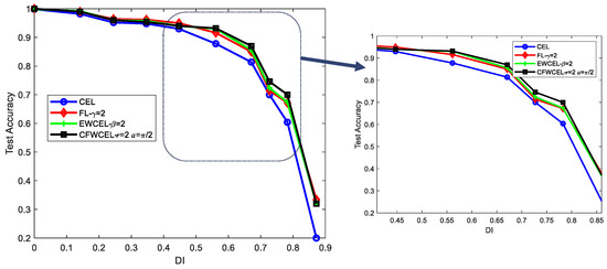 Figure 9 shows the recognition accuracy of four loss functions, like cross-entropy loss, CFWCEL (), Focal Loss () [12] and EWCEL () [10]. From Figure 9, it can be observed that no matter what kind of loss function is used, the recognition performance always decreases when DI increases. The realization of the anti-imbalance loss function can only suppress the occurrence of this decrease and improve the recognition rate relatively. It can also be seen that when , the results of CFWCEL, EWCEL, and Focal Loss are almost the same, and all of them are higher than 90%. When , CFWCEL shows a clear superiority among the four loss functions. In detail, the recognition accuracy of CFWCEL is higher than the other functions by about 1–3.5%. These results effectively verify the effectiveness of CFWCEL. When DI increases, CFWCEL prompts MR-CNN-A to pay more attention to hard samples.