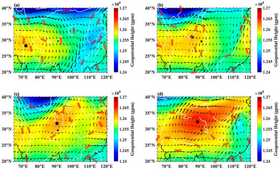 SAH has significant multicenter characteristics [33], particularly bimodality [5,34], which is attributed to the warm preference of the SAH. Only the Tibetan mode is considered in this study. Figure 2 shows the distributions of the ECMWF geopotential height at 200-hPa pressure level on 12 August (Figure 2a), 13 (Figure 2b), 14 (Figure 2c), and 16 (Figure 2d), overlaid with the wind fields. The black square in Figure 2 denotes the location of Lhasa, whereas the black circle denotes the center of the SAH that is associated with the largest geopotential height. As shown in Figure 3a, the center of the SAH gradually moved northeastward during the experimental period. After 14 August, two SAH centers formed, with one located over the TP and the other over the Iranian Plateau.