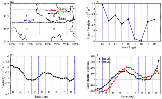 (a) The geographic locations of the ASMA centers from 12–16 August 2018. A-area (27.5–32.5°N, 65–80°E), B-area (27.5–32.5°N, 80–95°E), C-area (22.5–27.5°N, 65–80°E), and D-area (22.5–27.5°N, 80–95°E) were divided to identify the ASMA center (the black square represents the geographic location of Lhasa; the same symbols are used below); (b) the mean vorticity of 20 × 20 grids with the ASMA center considered as the geometric center, representing the strength of the ASMA; (c) the vorticity at 200 hPa over Lhasa from 12–20 August 2018; and (d) the geopotential height anomalies at 500 hPa and 100 hPa over Lhasa from 12–20 August 2018.