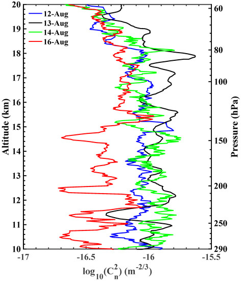 We selected four representative profiles obtained at night on 12–14 and 16 August 2018, as shown in Figure 4, to analyze the variation characteristics of under different ASMA strength states over the Lhasa. There were strong maximum peaks of at 17–18 km (about 100 hPa). Certainly, a weak and thin maximum peak of Cn2 appeared at around 12 km (about 200 hPa), such as the 16 August 2018.