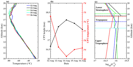 (a) Vertical temperature profiles from 12 to 16 August 2018. (b) Cold-point tropopause height (the black line) and temperature (the red line) from 12 to 16 August 2018. The lowest layer of the multi-tropopause serves as the CPT height. (c) First-order linear piecewise fitting to within the upper troposphere, tropopause, and lower stratosphere.
