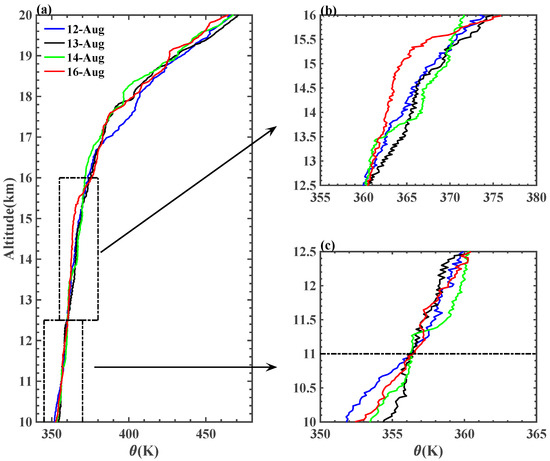 (a) Vertical profiles of potential temperature on 12–14 and 16 August 2018. (b,c) show magnified views of the 12.5–16 km and 10–12.5 km ranges, respectively.
