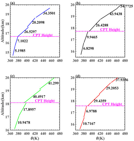 The piecewise fitting lines of potential temperature in tropopause and lower stratosphere. The potential temperature profiles are linearly fitted with the least-square method at intervals of 1000 m. The numbers indicate the coefficients (unit: K/km) of the piecewise fitting, indicating the potential temperature lapse rates. The pink dotted lines represent the corresponding CPT heights. (a) 12 August 2018, (b) 13 August 2018, (c) 14 August 2018, and (d) 16 August 2018.