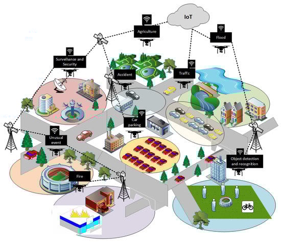 Today people have been witnessing rapid evolution in almost every field of life because of the emerging trends of collaborative and communication technologies. The rapid advancement, deployment, and integration of IoT, artificial intelligence, drone, robotics, cloud or edge computing, big data analytics, future communication networks, and aerial access networks have also been accepted as key enablers for different smart city applications. Due to aerial access networks, which can be established depending upon either low-altitude or high altitude platforms, when combined with IoT, satellite, and physical infrastructures, enable a complete access network with global coverage and various quality-of-service provisioning. Figure 1 shows the collaboration of IoT, drone cameras, intelligent communication, and aerial access technology that can lead us toward high standards and quality of life by providing smart public safety disaster management, smart agriculture, environmental aspects, and services. These services may assist in traffic control by providing congestion-free routes to the users, unusual even detection, fire monitoring, energy efficiency, network connectivity, monitoring, and most importantly, security and surveillance applications. Recently, improvements in advanced aerial devices and technologies, such as the growth of small, smart, and economical communication networks, satellites, and the large availability of aerial drones and unmanned vehicles, have transformed numerous security and surveillance applications. Furthermore, when connected with future communication networks and satellites, these devices also enhance real-time assistance for smart cities, as depicted in Figure 1.