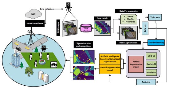 This article investigates the collaboration performance between the Internet of things (IoT) and drones. This might be essential in providing timely and important wireless communication assistance in various public safety applications, as shown in Figure 1. It could help to explore areas that are difficult to reach and that provide immediate coverage and connectivity for the services’ recovery right after a disaster by improving overflow capacity. Thus, to deliver such vital facilities for public safety, the collaboration between IoT and drones can support public safety requirements in the case of disasters, such as real-time monitoring, real-time analytics, and enhanced decision making to support smart city applications. Successful results of the deep learning designs inspired us to introduce an IoT-enabled solution for smart surveillance and monitoring in smart city applications. The system is based on artificial intelligence that uses a deep learning model, PSPNet [], for object segmentation in the aerial drone data set. The model utilizes a pyramid parsing module that uses global context information for various region-based context collections. The local and global traces collectively produce more stable final predictions. The PSPNet architecture needs the global information of the image in order to predict the local predictions; therefore, it delivers more reliable results on benchmark data sets, such as PASCAL VOC 2012 and cityscapes. Furthermore, the model performs better than FCN because pixel classifiers cannot obtain the context of the entire input image. The overall work performed in this article consists of the following steps: we firstly implement data augmentation techniques to increase the architecture’s performance. Then, we apply transfer learning and train the pre-trained segmentation model on the aerial data set. In this work, we use a benchmark publically available data set named Aerial Semantic Segmentation Drone data set (https://www.tugraz.at/index.php?id=22387) (19 June 2022). Finally, we examine and compare the segmentation architecture with three different CNN classification designs, particularly VGG-16, ResNet-50, and MobileNet. The primary goals of the article are presented as follows: