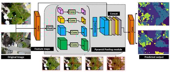We applied the PSPNet model for the segmentation of objects in aerial images. It is developed by [], one of the common well-accepted object and image segmentation models. The architecture of PSPNet predicts the local level predictions using the global context of the input image, providing better results on benchmark data sets. The model is better than FCN-based pixel classifiers as it could not obtain the meaning of the entire image. The overall architecture is presented in Figure 4 mainly divided into two main stages: encoder and decoder. As discussed earlier, that encoder extracts output features from the image, whereas the decoder is used to predict the pixel class at the end. The encoder part of PSPNet has comprised the CNN-based backbone architecture with dilated convolutions and the pyramid pooling module as described in Figure 4.