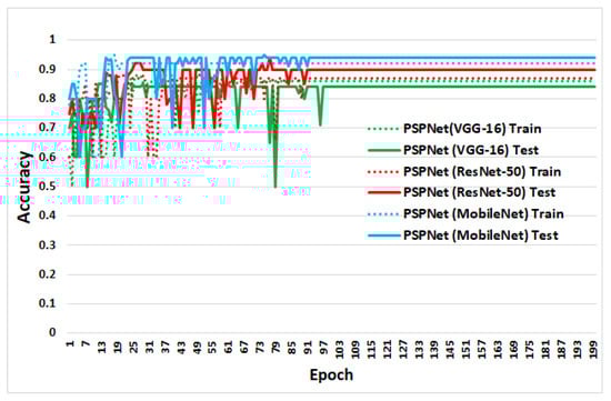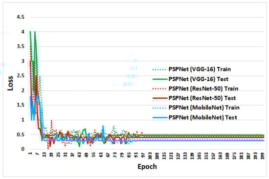 We defined the learning rate to be 0.01 and the power to be 0.9 for our experiments. The performance of the model can be increased by improving the training iteration. The weight decay and momentum of the model are set to 0.0001 and 0.9, respectively. Due to insufficient physical space on GPU, we initiated the “batch size” to 16 throughout training. The loss curve for training and testing of the PSPNet with CNN classification architectures is shown in Figure 6 and Figure 7.