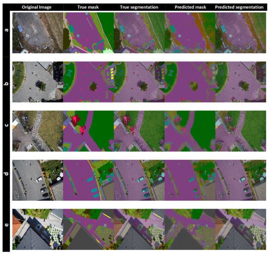 The segmentation results of the above discussed system are presented in Figure 8. It can be observed that the system achieves good results for various objects in aerial drone data. We tested the developed system for different test images. In Figure 8, the first column visualizes the primary input images; the second and third column displays the true label masks and segmentation images, whereas the last two columns represent predicted mask and segmentation results. We have presented segmentation results for five testing images (row-wise). From Figure 8a, the segmentation architecture effectively segmented the road and ground in the image. In Figure 8b, the road area along with trees and multiple people at different locations is accurately segmented. Similarly, the grass and road are accurately segmented in Figure 8c,d. The design also segmented the covered building efficiently, as observed in the last row of Figure 8e.