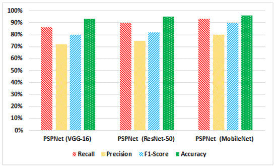 The developed system is evaluated in terms of accuracy, and different evaluation matrices are applied []. Every pixel of the test image is categorized into four classes according to prediction and ground truth results, which are True Positive (TP), True Negative (TN), False Positive (FP), and False Negative (FN). Using different parameters given in Figure 9, we estimated the precision, recall, and accuracy of the system as described in Figure 10. It can be recognized that the developed system produces excellent results with various classification architectures. The precision rate of the segmentation paradigm with VGG-16 is 72%, with ResNet-50 is 75%, and with MobileNet is  80%. For VGG-16, ResNet-50, and MobileNet, the Recall rate is 86%, 90%, and 93%, respectively. The F1-Score ranges between 80% and 90% for all classification architectures. The system’s accuracy is high with MobileNet, i.e., 96%, whereas for the other two, it is 93% and 95%, respectively.