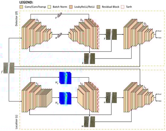 The great capability of GAN to approximate data distributions among the others can be employed for localizing anomalous elements in visual-based anomaly detection applications [,]. To this end, the network ability can be refined to learn features by modeling more abstract information from training samples, achieving pixel-wise localization. Therefore, the strategy is to understand the details appearing frequently in normal frames, employing them to predict abnormal areas within the scene. Moreover in this case, this is achieved by learning the manifold of normal data while preserving spatial information. Indeed, the bottom branch of the proposed network architecture, i.e., the localizer L, has similar components and structures of the model D described in Section 3.1. However, for the localizer, the low-dimensional representation is a set of 2D feature maps that can be used to define an heat map localizing regions of interest in the image. To achieve this, different from , the last convolution in the localizer encoder is replaced with three residual blocks [] to improve localization performance [] having more abstract representations of input frames. Precisely, similar to the detector branch, the L model learns to reconstruct only the frames depicting a normal scene but exploiting the instructive latent set of feature maps rather than a single vector, i.e., the learned manifold of normal data containing spatial information.