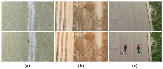 The UMCD [] is a benchmark dataset for mosaicking and change detection systems, containing low-altitude RGB video streams ranging from 6 to 15 m, with speeds ranging from 2 up to 12 m/s, at different daily times, i.e., morning and afternoon. Specifically, all videos were acquired employing two different small-scale UAVs, a DJI Phantom 3 Advanced with a built-in camera each, and a custom home-made hexacopter having cameras with different spatial resolutions, ranging from 720 × 540 to 1920 × 1080 pixels per frame. Concerning the visual data, the UCMD dataset includes 50 aerial video sequences collected in different environments, i.e., urban, dirt, and countryside (CS). Among these, only a subset of 20 video sequences was devised for change detection and can be adapted to anomaly-related tasks. Indeed, they consist of pairs of videos where each couple shows a given path with and without specific elements, as shown in Figure 5, which can be targeted as anomalous. Details are reported in Section 5.1. Finally, the remaining 30 videos were excluded from the model training since they do not present anomalies for tests.