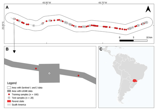 (A) Study area, with the distribution of data and samples along the transmission line. (B) Zoom of the area with LiDAR data and examples of training and test samples. (C) Location of the state of Paraná in South America.
