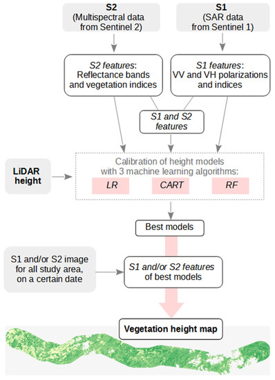 This strategy can be achieved through the application of machine learning techniques, which consists of learning a predictive model from satellite image features and known reference height values. Such height reference can be obtained by airborne LiDAR, which has proven to be a good substitute for field data. From the fitted predictive model and the remote sensing features used to adjust it, it is possible to estimate the vegetation height for unknown cases. Machine learning algorithms, such as Linear Regression (LR), Classification And Regression Trees (CART), and Random Forest (RF), have been effectively used in many remote sensing forestry applications [12,13].