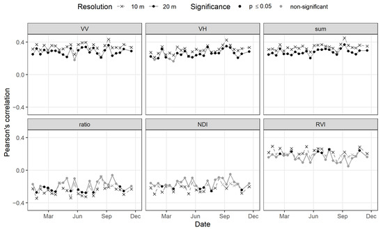 Correlation coefficient of LiDAR heigh against the 6 Sentinel 1 (S1) features, both for 10 m and 20 m resolution, for all available dates in 2021. Dates with significant correlation are represented in black.