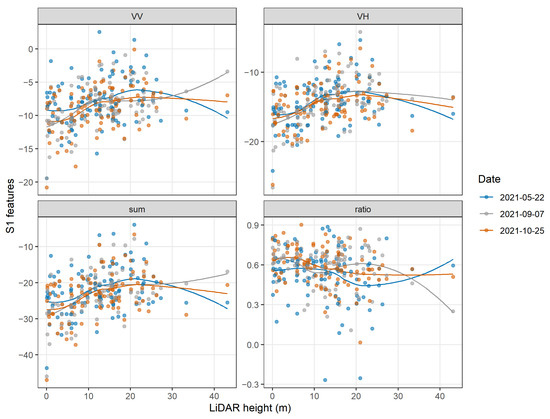 Relationship between the LiDAR height and the Sentinel 1 (S1) features that presented the highest correlation (for 10 m resolution), for the three dates used in the construction of the vegetation height models.