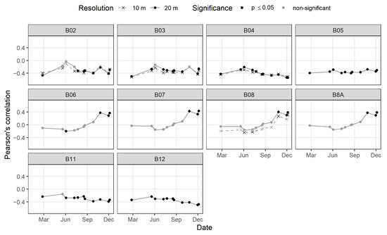 Correlation coefficient of LiDAR heigh against the 10 Sentinel 2 (S2) bands, both for 10 m and 20 m resolution, for dates in 2021 with at least 85% of the samples without cloud. Dates with significant correlation are represented in black.