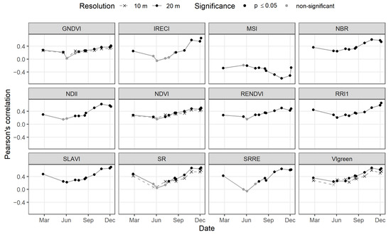 Correlation coefficient of LiDAR heigh against the 12 Sentinel 2 (S2) vegetation indices, both for 10 m and 20 m resolution, for dates in 2021 with at least 85% of the samples without cloud. Dates with significant correlation are represented in black.