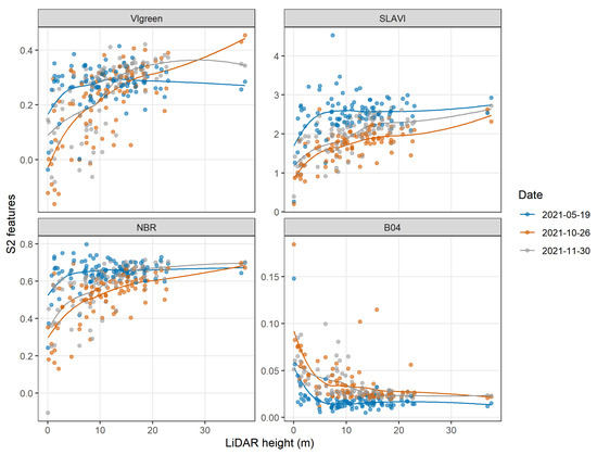 Relationship between the LiDAR height and the Sentinel 2 (S2) features (VIgreen, SLAVI, NBR, and B04) that presented the highest correlation (for 20 m resolution), for the three dates used in the construction of the vegetation height models.