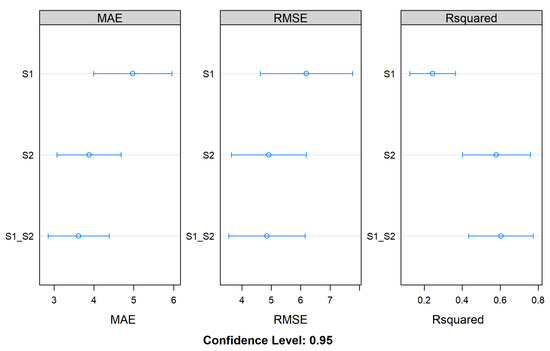 Table 4 shows the results of the performance metrics (MAE, RMSE, and R2) for the S2 models. In general, S2 models showed better performance than S1 models, with MAE ranging between 3.88–7.52 m, RMSE between 4.79–10.37 m, and R2 between 0.08–0.58. However, the S2 models showed great variation in performance depending on the date of acquisition, with the date of 19 May showing the worst results and the dates of 26 October and 30 November, the best.