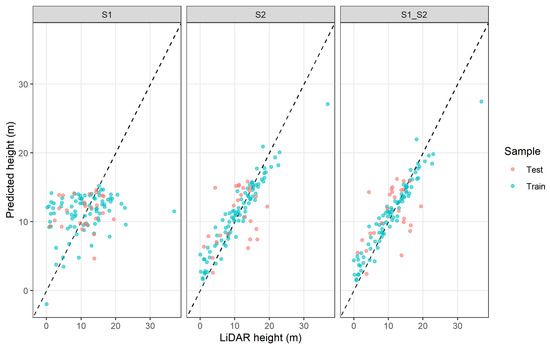 Predicted versus observed height of the best models for each data source (S1- Sentinel 1, S2- Sentinel 2, and S1_S2- both Sentinel 1 and 2), from the training and test samples.