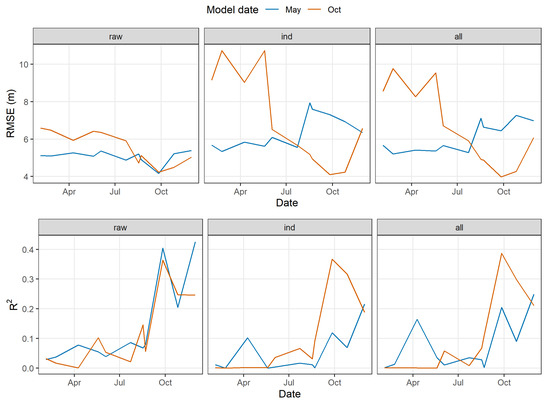 Temporal variation of RMSE and R2 from the test sample for the best multisensor models based on three data subsets (“raw”, “ind”, and “all”).