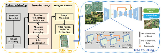 In general, most existing methods of tree detection and counting are concentrated on satellite images [1,2,3,4,5]. Firstly, the whole large scale remote sensing image is split into hundreds of patches using the sliding window technique. Then classification or detection-based methods are used to detect and localize the targets. Finally, the detection results from individual patches are fused into the whole remote sensing image. The satellite technique is a powerful tool for monitoring tasks, including land cover change detection, fire monitoring, urban construction, natural disaster monitoring, etc. Recently, UAVs have become promising tools to obtain high quality images with low-cost, lightweight and high frequency usage, which have potentials for various analysis and monitoring domains, including environmental monitoring and analysis, precise and intelligent agriculture, and disease detection [6]. However, what UAVs acquire with camera devices is a series of image data, and sequence image detection could result in a lot of duplication, which is not convenient and reduces detection efficiency and quality in large scale regions. Therefore, aerial image mapping is a necessary task before image analysis.