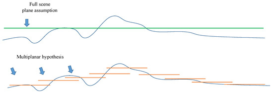 In Figure 2, unlike the general full-scene plane assumption, our proposed method adopts the multiplanar assumption, that is, each image captured is assumed to be flat. The general full-scene plane assumption could result in larger estimation bias. This multiplanar assumption processing method weakens the shortcoming of full-scene plane assumption and improves the generalizability of the method for aerial image stitching.