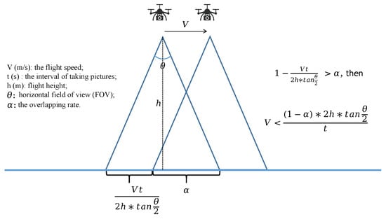 The relationship among the following significant parameters: flight speed is V (m/s), flight height is h (m), horizontal field of view (FOV) is , the overlapping rate is , the interval of taking pictures is t (s). In order to guarantee the overlapping rate, the above-mentioned parameters should meet the equation shown in the figure.