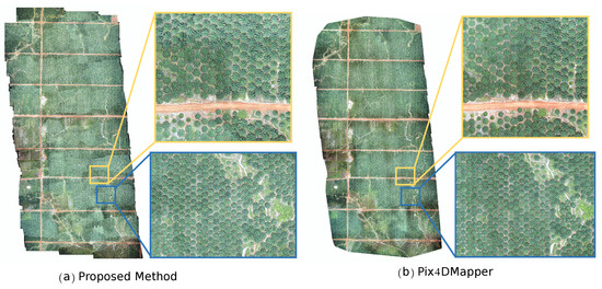 The typical overview results of acacia and oil-palm datasets are shown in Figure 4 and Figure 5 with some detailed screenshots. From the figures, we could find that the stitching procedure could be able to generate live mosaicing with high quality, which is comparable to, and even better than, that of the offline processing commercial software Pix4DMapper.