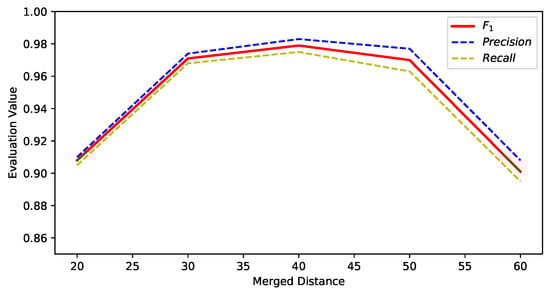 After generating the orthophoto mosaicing with sequential aerial images, the large scale orthophoto mosaicing is split into hundreds of tiles with a length and width of 256 pixels, which is effective for analysis with the http protocol and parallel computation. As shown in Figure 8, the tree in boundary would be detected in tile 1 and 2, respectively; the duplicate statistics for the boundary between the tiles will lead to inaccuracy counting statistics. If the center point distance between two adjacent tree masks is less than the preset merged distance, two points or more points would be fused into one point. Therefore, the merged distance is used to filter the duplicate statistics to further correct the counting results. To evaluate the results, if the ground-truth point is among the mask regions, the predicted mask is regarded as the truth positive (TP). It could be seen that the is significant to the experimental results. Thus, several pre-experiments are conducted to obtain the proper value for parameter . According to the collected aerial images, we define the range from 20 to 60, through several detection validation experiments, we compute precision, recall, and on acacia and oil-palm confused dataset under different merged distances . From Figure 9, we could find that, 40 of is the best parameter choice, which is used for the following experiments.
