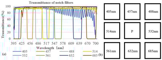 (a) Transmittance of notch filters and (b) their locations in the multi-aperture imaging system. P indicates the aperture used for capturing panchromatic images. The central wavelengths of the notch filters are 405, 457, 488, 514, 532, 561, 632, and 685 nm.
