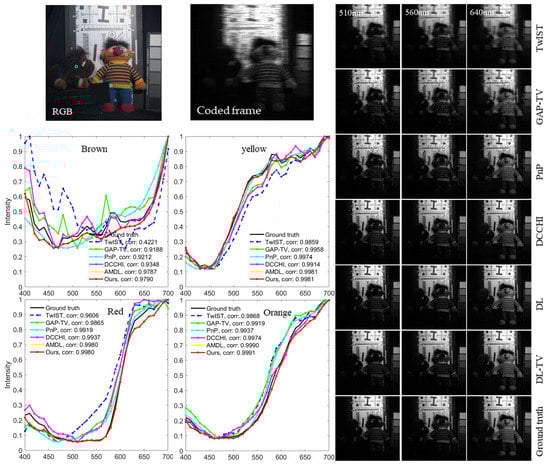 Reconstruction spectra of “toy” MSI of the CAVE dataset. The original RGB image and the coded frame of the scene are shown at the top. The spectra of four color regions are shown on the left. The three reconstructed frames at wavelengths 510, 560, and 640 nm are shown on the right.