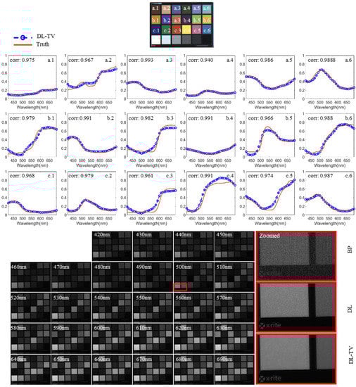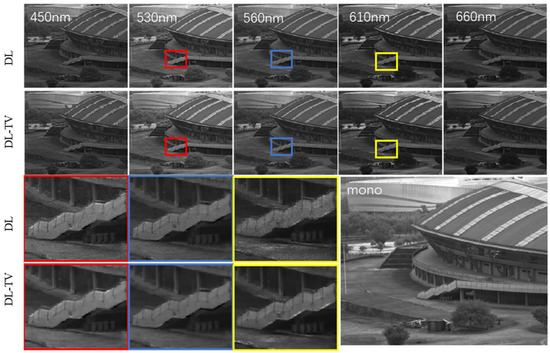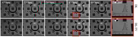 First, the notch-filter-based multi-aperture multispectral imaging system was built using nine monochromatic cameras, each with a resolution of 1024 × 1280 pixels, and this prototype system was used to capture the ColorChecker card and target image (ISO 12233 2014 eSFR) in an indoor environment. Eight notch-filtered images and one panchromatic image were collected in a single shot. The captured images were then processed using the proposed algorithms to reconstruct 31 bandpass spectral images. The illumination was provided by a spectrum-tunable light source (Thouslite-LEDCube) and was limited to the spectral range of 420–690 nm; therefore, the spectra of the MSIs in the experimental part also range from 420 to 690 nm, with the spectral bands of 28, as also reported in [47]. Figure 6 shows the reconstructed spectrum for 18 color blocks and the reconstructed MSIs for all bands. The exposure time for acquiring the notch-filtered and panchromatic images was 4 ms (frame rate of up to 250 fps). Simultaneously, the bandpass spectral images that were captured by the bandpass filters (THORLABS-FB) were obtained with the same exposure time. Figure 6 reveals that the calculated spectrum of the color block is almost the same as the ground truth captured by the hyperspectral camera (GaiaField_V10E), implying that the proposed system can restore the spectral information of the target scene. Figure 7 compares the hyperspectral images reconstructed by the proposed system with the DL and DL-TV algorithms. For demonstration, an ISO 12233 target was used along with the reconstructed spectral images with central wavelengths of 450, 530, 560, 610, and 660 nm, as shown in Figure 7. Figure 7 demonstrates that in the calculated spectral images, the detailed features and texture information of the ISO 12233 target are well preserved, indicating that the proposed system and algorithm do not reduce the spatial resolution of the target scene. In both scenes, it can be observed that compared to DL, DL-TV can effectively remove the noise from the actual captured data and can restore the target scene with higher accuracy. This experiment demonstrated the effectiveness of the prototype system and proposed algorithm for super-resolution spectral imaging.