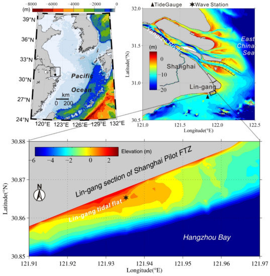The study area (Figure 1) is situated on the artificial coast of the Lin-gang New Area of the Shanghai Free Trade Zone (hereinafter referred to as Lin-gang), and is located at the intersection of a mega estuary (the Yangtze River Estuary) and a semi-closed bay (Hangzhou Bay). The land area was reclaimed by building a seawall in 2003. The coastal vegetation includes local vegetation (Phragmites), artificial vegetation (Scirpus triqueter), and invasive vegetation (Spartina Alterniflora Loisel).
