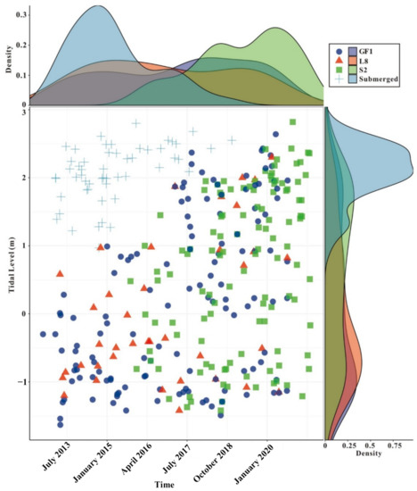 The satellite image time series and the corresponding tidal levels, the top and right panels show the trends of the relative data density. GF1: Gaofen-1; L8: Landsat-8; S2: Sentinel-2; and Submerged: The entire tidal flat is submerged.
