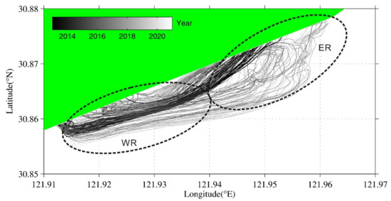 All of the waterlines derived from the satellite images. The darkness and line width represent time (i.e., darker and thicker indicate older). WR and ER are the eastern and western regions of the tidal flat, respectively.