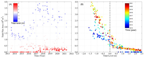 Figure 9A presents the TFA time series at the higher and lower tidal levels relative to the mean sea level (MSL = 0 m). For a tidal level of higher than 2 m, before 2019, the seawater could cover the entire tidal flat and the corresponding area was zero. After 2019, the satellites did not capture the above situation, even when the tidal level was higher than 2.5 m. For a tidal level lower than −1 m, there was very obvious accretion from 2013 to 2019. In 2018, the largest area of the entire tidal flat (including the supratidal and intertidal zones) reached ~4 × 106 m2. After this, the TFA transitioned to the rapid reduction phase. In 2021, at a similar tidal level, the largest TFA had decreased to ~3 × 106 m2.