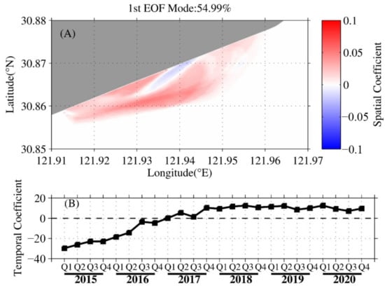 To guarantee enough data to reconstruct the DEM, the quarterly waterlines in the LGTF from 2015 to 2020 were considered. Figure 10 shows the domain of the EOF mode, which was statistically significant and explained 55% of the total variation. Regarding the spatial pattern, most of the regions of the tidal flat were positive, which means the tidal flat accreted or eroded simultaneously. It should also be noted that there was an opponent belt zone (NE–SW direction, parallel to the sandy beach), which coincided with the location of the tidal creek (Figure 2C). Since the bulks of the two opponent regions did not match, the sediment in this belt zone should not be the main source or sink for the rest of the regions.