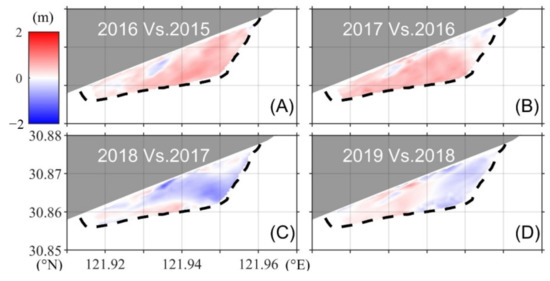 To discuss the necessity and reasonability of the above studies, the geomorphological measurements conducted at the end of each year from 2015 to 2019 were compared year by year (Figure 12). Gradual accretion occurred throughout the entire tidal flat from 2015 to 2017. After this, the LGTF transitioned to the erosion phase, mainly in the ER. The temporal trend of the geomorphological changes based on the monitoring data was consistent with the results obtained from the satellite images.