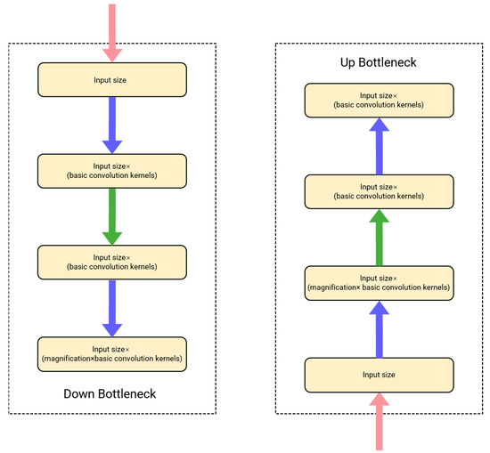 Since the bottleneck structure was not originally designed for semantic segmentation, only the flow of low-semantic information to high-semantic information was considered in the data extraction. In the decoder part of the encoder–decoder process, it decodes and restores low-semantic information according to high-semantic information. However, it was not feasible to use the bottleneck structure directly. To this end, a module corresponding to the bottleneck structure was designed to realize the flow of high-semantic information to low-semantic information in the decoder part, naming it UpBottleneck (see Figure 2). In order to correspond to the UpBottleneck structure, we also renamed the bottleneck structure in the encoder part to DownBottleneck. The two structures were designed to work together to provide the entire process of remote sensing images, from encoding to decoding.